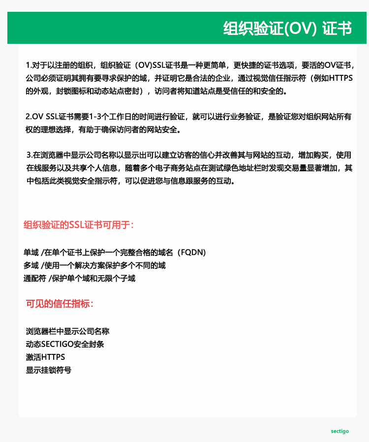 OV SSL:组织验证(OV)证书需要验证申请人的组织资料,以确保它是一个实际的组织。他们验证组织名称,地址,和电话号码。这些数据必须与WHOIS信息、公开政府信息网站或批准的第三方网站吻合。