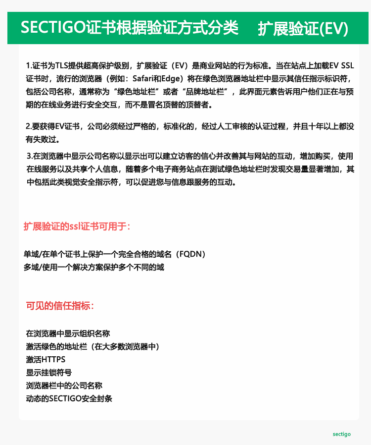 EV SSL:扩展验证(EV)证书也被称为“绿栅”的证书。它被称为最值得信赖的SSL证书类型。在EV验证过程中,发行供应商或CA完整的验证出申请者是合法的业务和良好的信誉。这个过程一旦顺利完成,并发出了申请者的EV SSL将被激活,所有的浏览器指标在申请者的网站上。最重要的指标是在用户的Web浏览器的“绿栅”,这意味着更值得信赖。