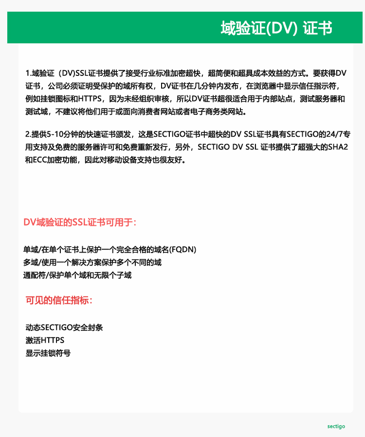 DV SSL:域名验证(DV)证书只需要申请人验证他/她是该域名的所有者。验证只需接收到属于该域的验证申请人拥有使用权域的WHOIS信息或电子邮件地址发送一封电子邮件即可。